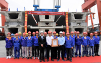 今天,在浙江舟山,中鐵大橋局舟山港主通道項目部收到了上海大世界基尼斯總部頒發(fā)的證書,由天業(yè)通聯為大橋局提供的TLMEL1200t輪胎式搬運機成功入選了大世界基尼斯之最。TLMEL1200t型輪胎式搬運機由天業(yè)通聯為中鐵大橋局寧波舟山港跨海大橋項目量身打造。能實...